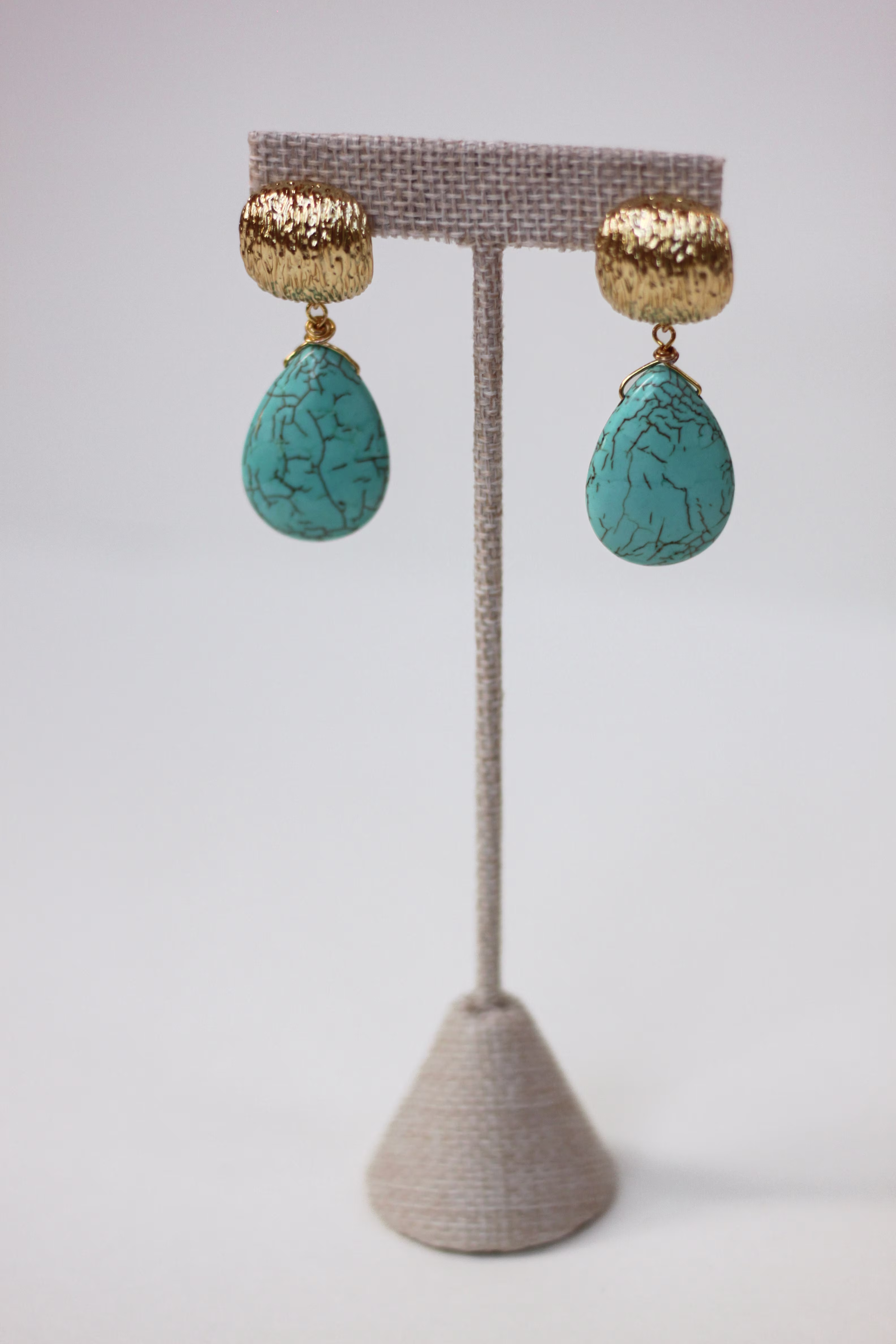 Bold Turquoise teardrop drops suspended from textured 18k gold plated posts.